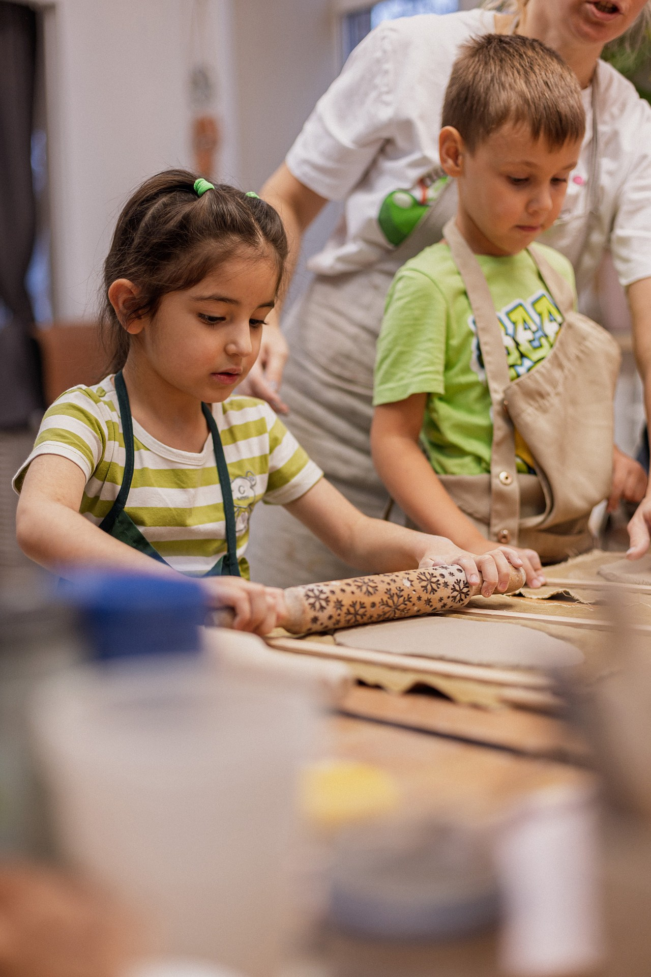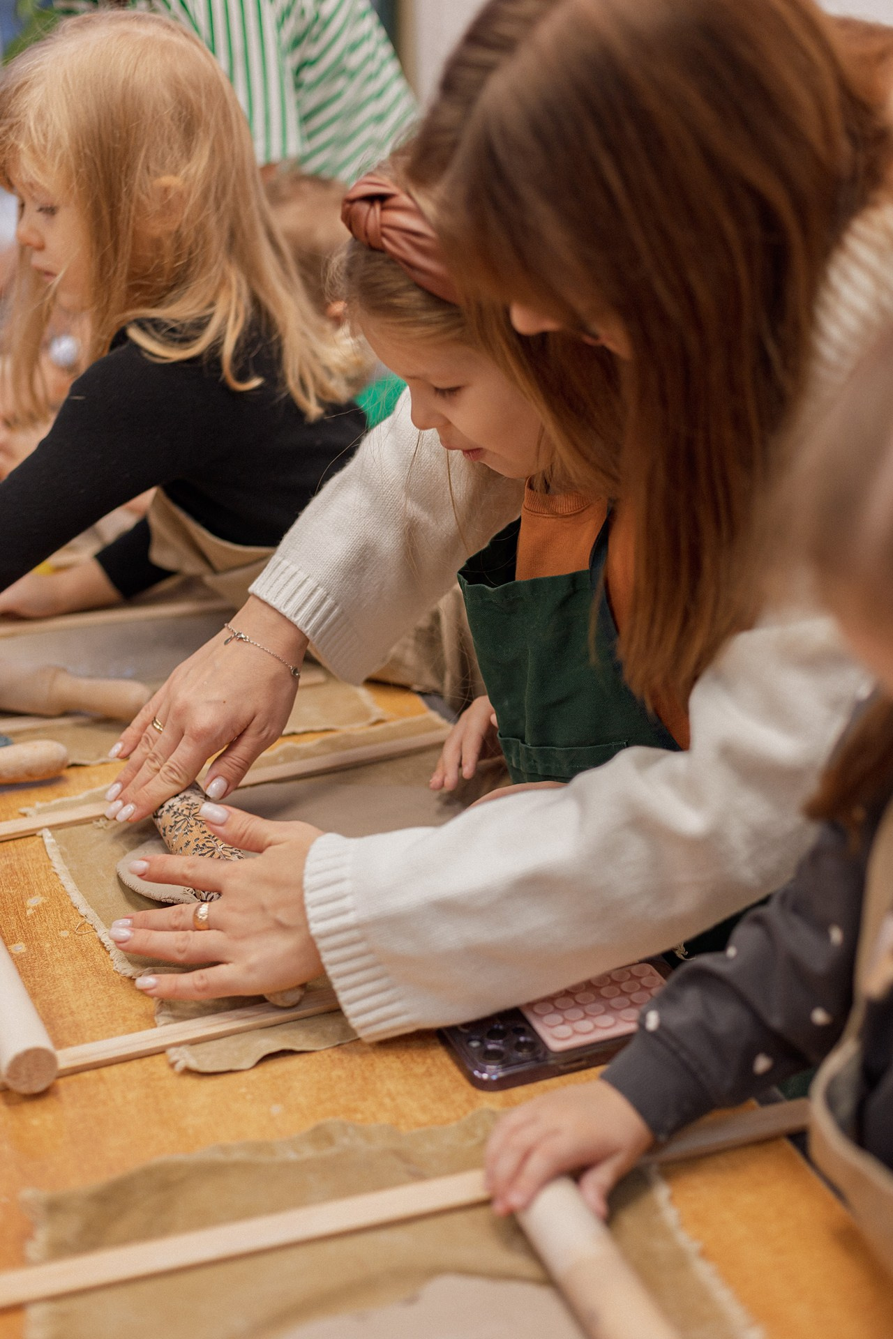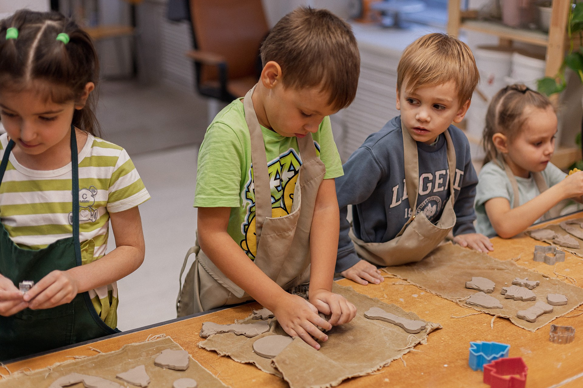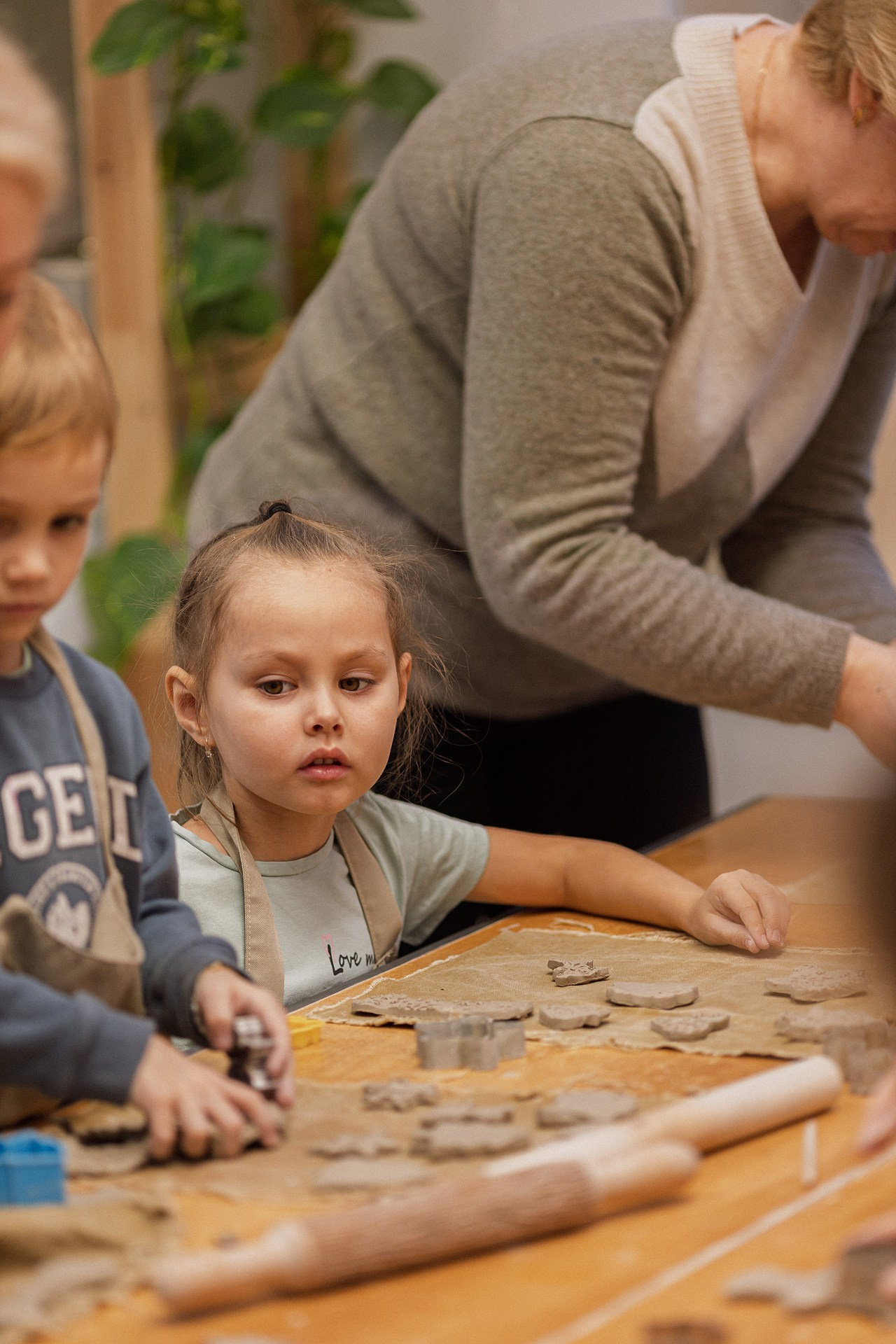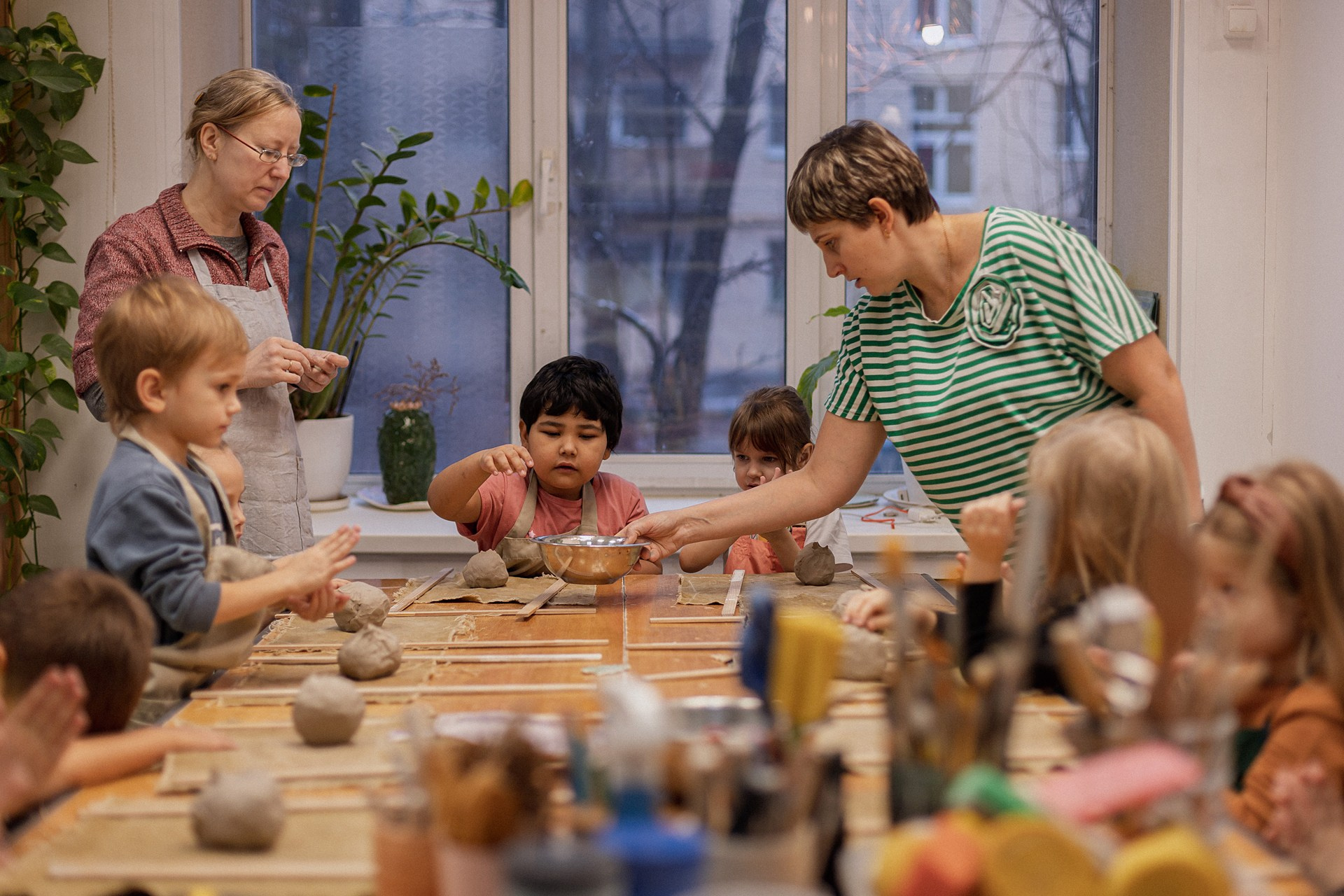 Детишки делали ёлочные игрушки, потом их обожгут в специальной печи при 1000 градусах и они будут готовы.
