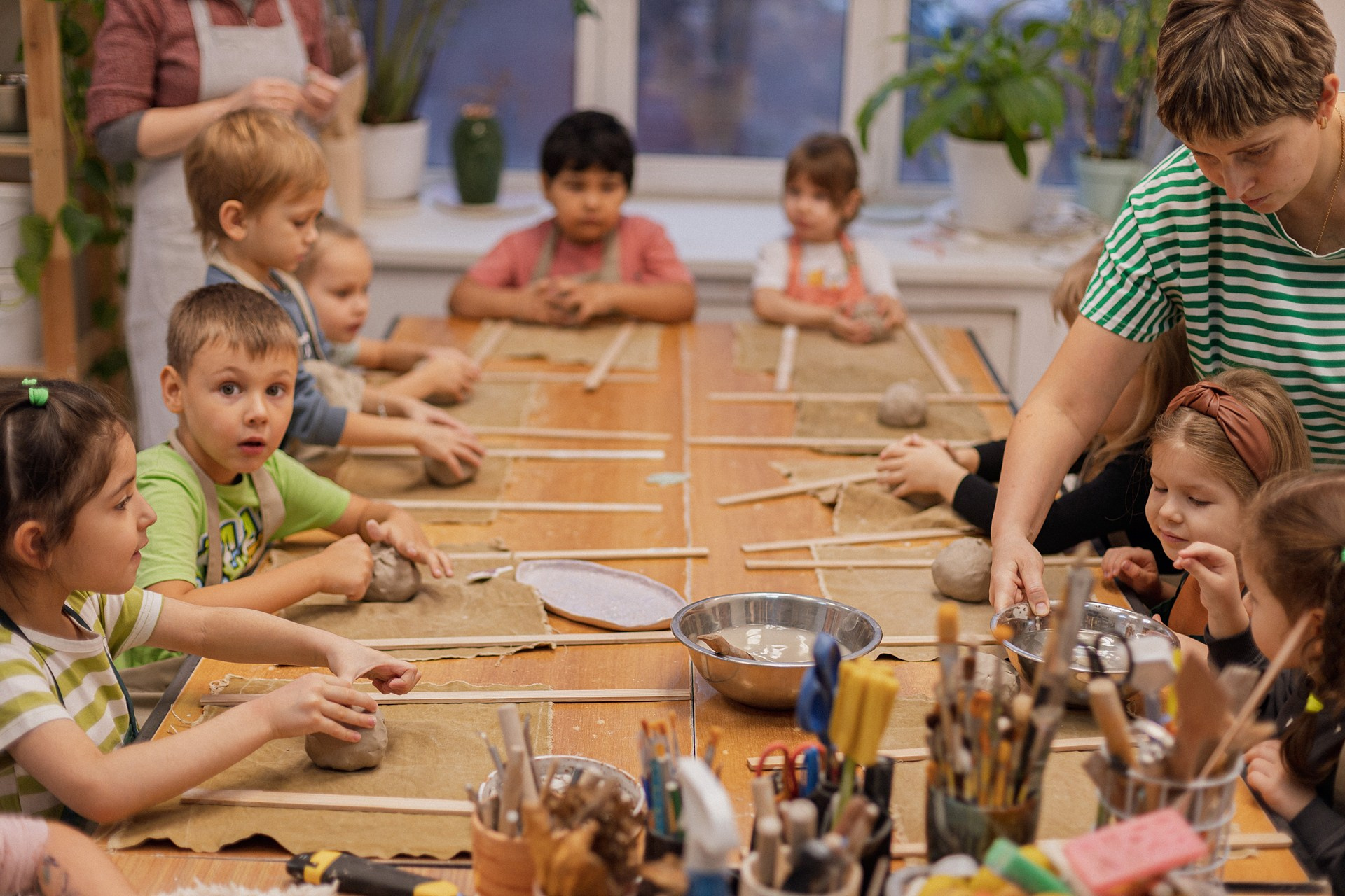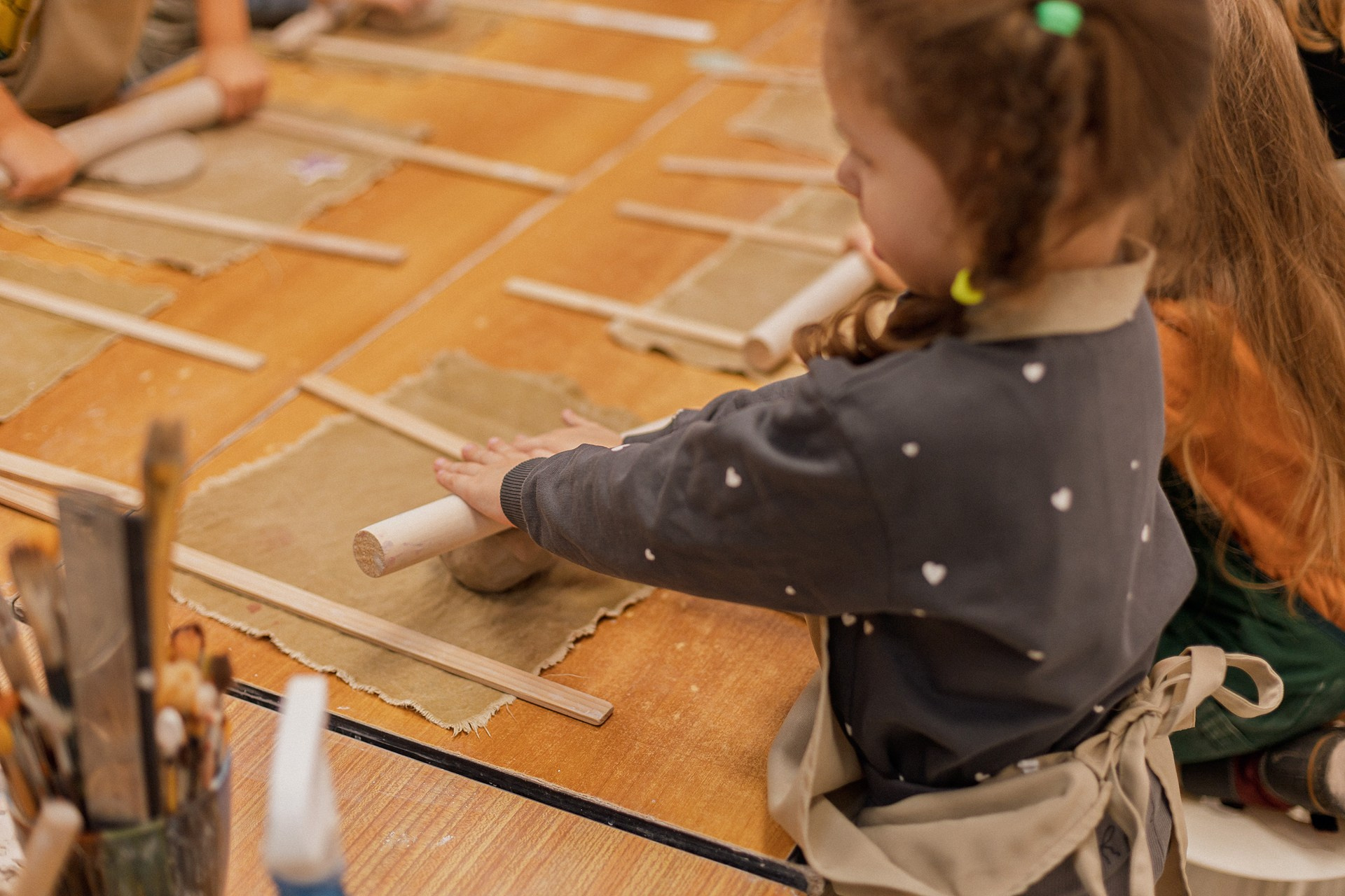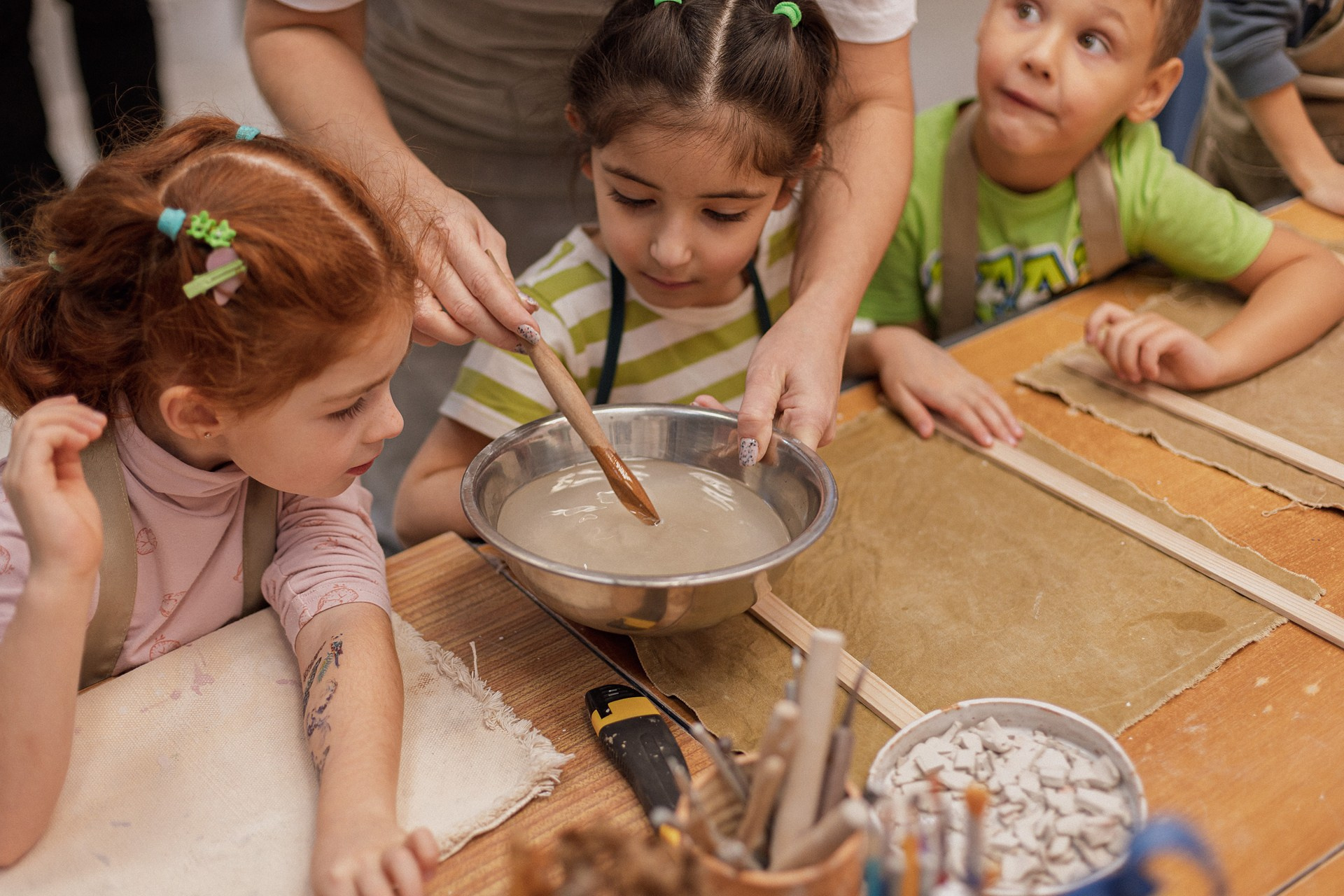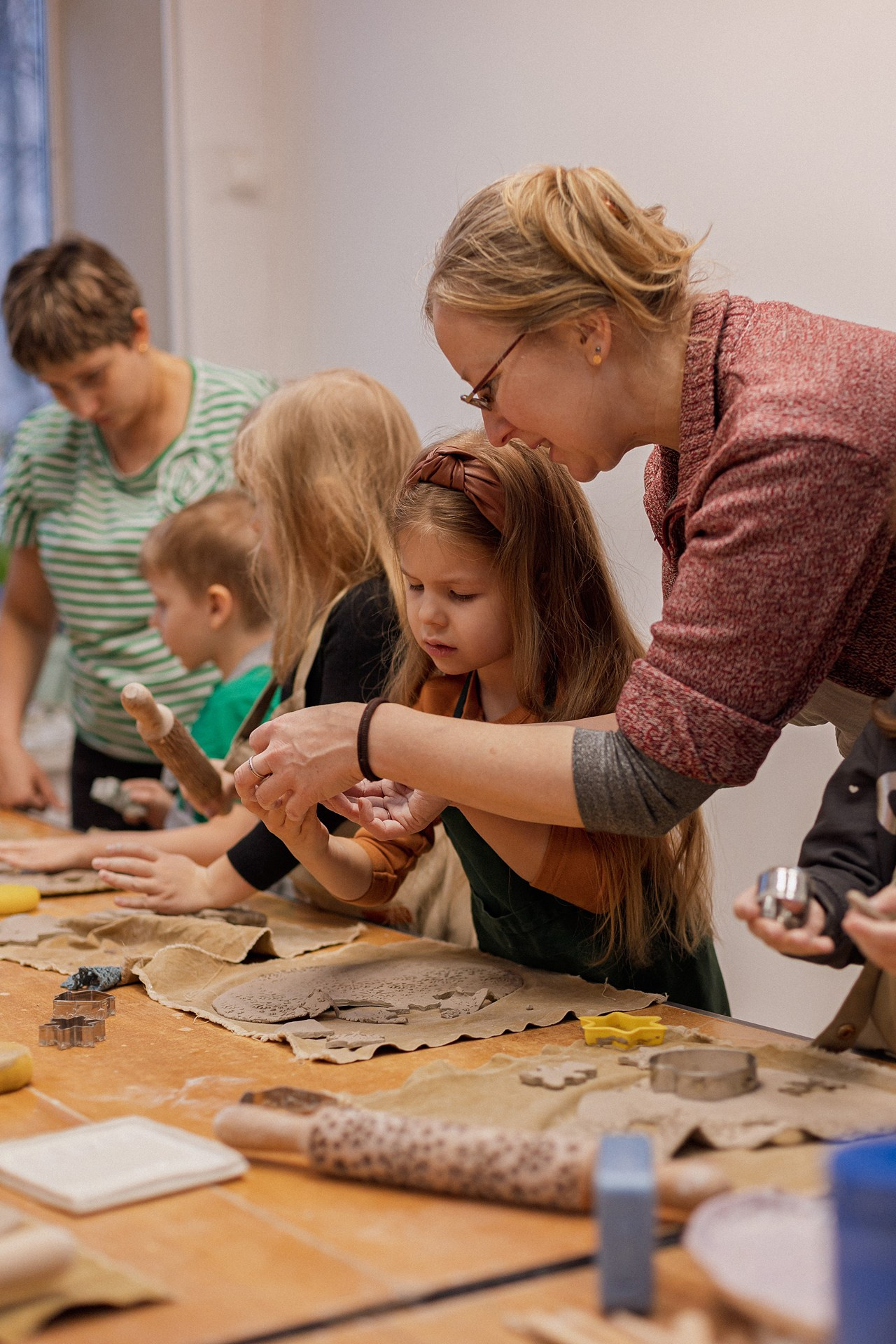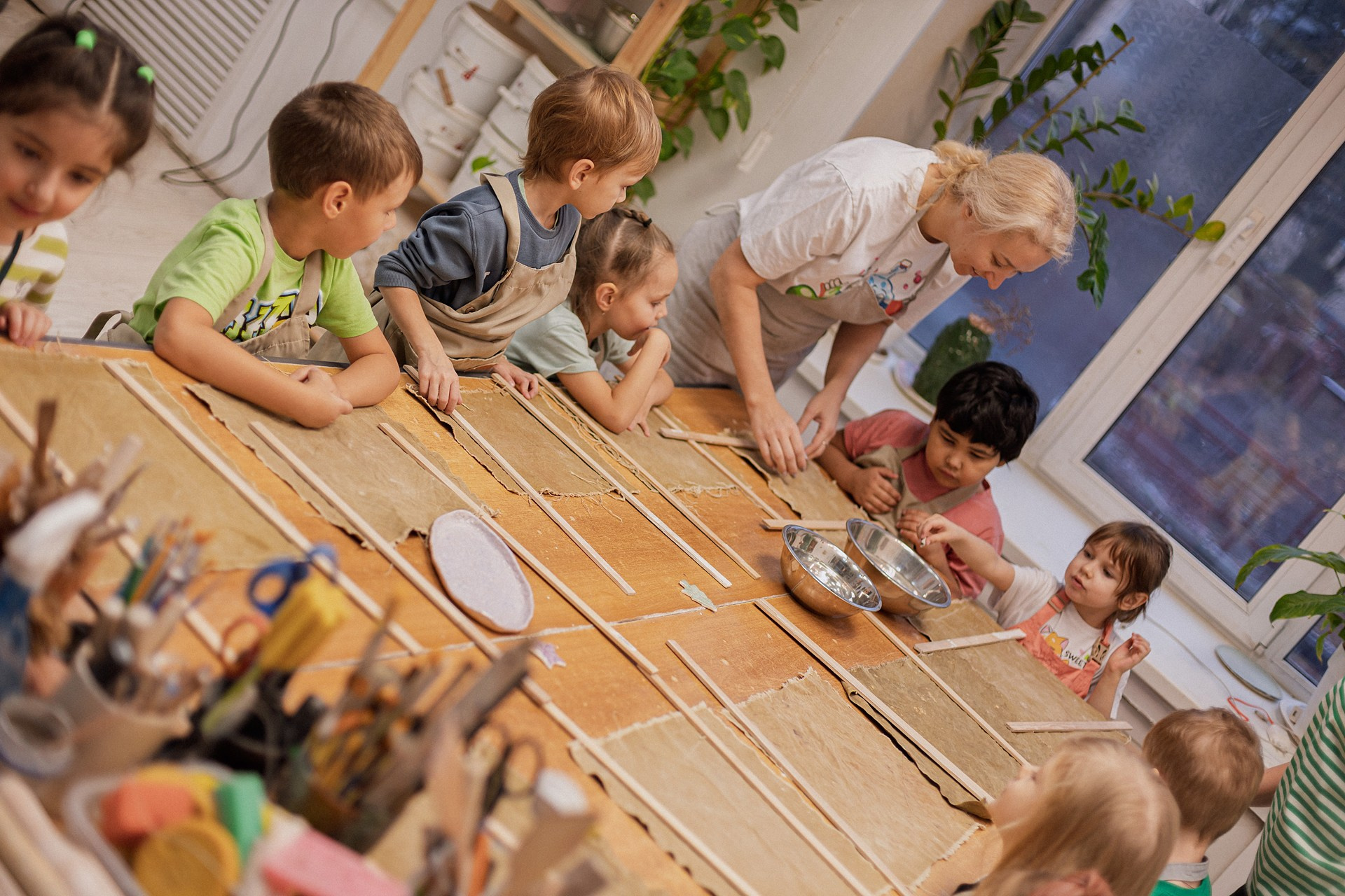Детишки делали ёлочные игрушки, потом их обожгут в специальной печи при 1000 градусах и они будут готовы.